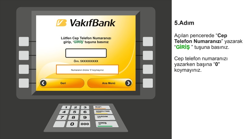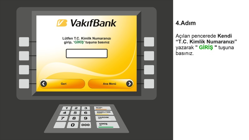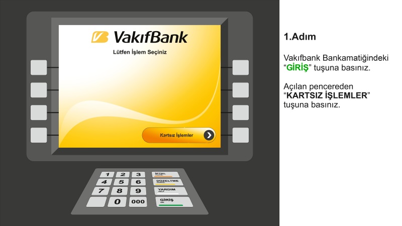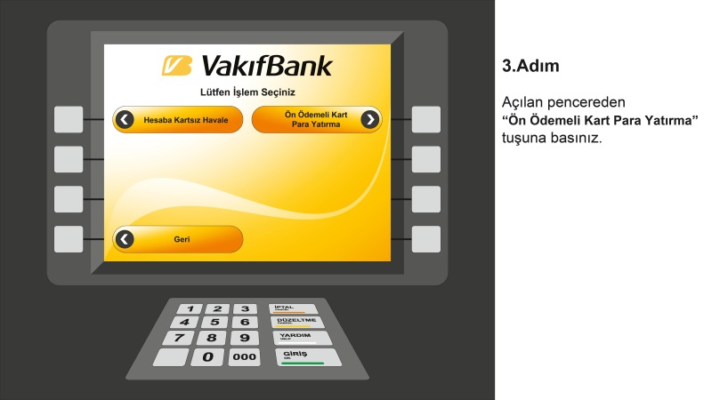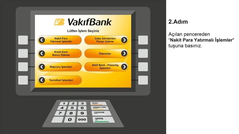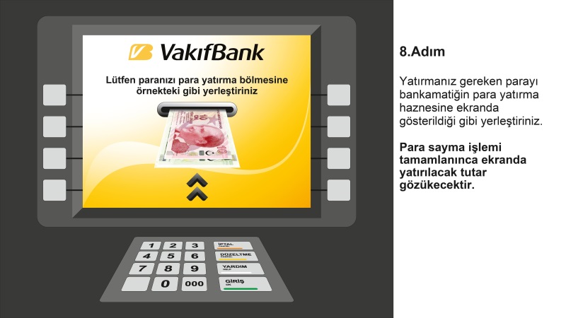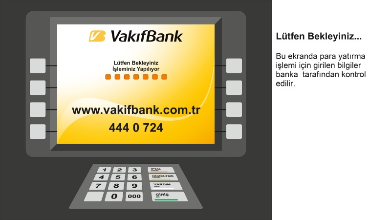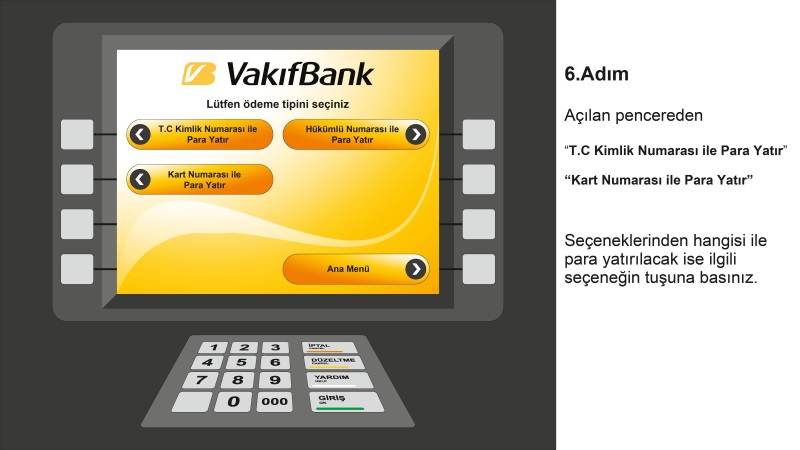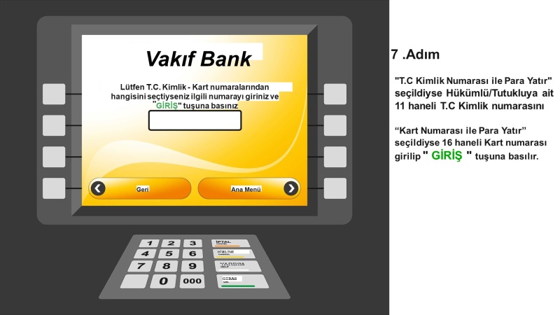 Hükümlüler adına para yatırma işlemi sadece Vakıfbank ATM ve şubelerinden kartsız olarak gerçekleştirilecektir. Hükümlü adına yatırılan paralar herhangi bir kesinti olmadan hükümlülerin kart bakiyelerine eklenmektedir. Bankamatikten para yatırma işlemi, size verilen 8 haneli veya 9 haneli ID numarasıyla ya da 16 haneli kart numarası ile yapılacaktır. Para yatırılırken aşağıdaki sıralamaya dikkat edilmelidir.